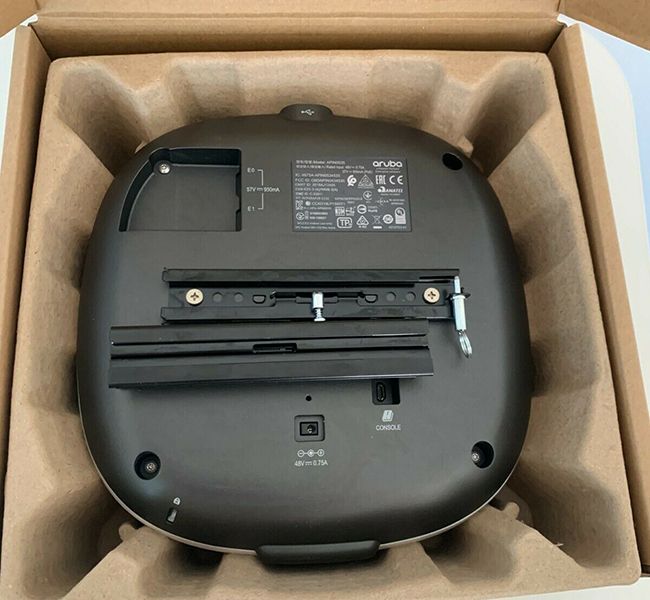 - Mặt sau sản phẩm là nơi bố trí các cổng kết nối, bao gồm: 1 cổng nguồn DC 48V, 1 cổng USB Controller và 2 cổng RJ45 2.5 GbE hỗ trợ cấp nguồn PoE chuẩn 802.11af/bt cùng tính năng giám sát nguồn thông minh. Linh kiện giá treo được tích hợp sẵn, cho phép người dùng có thể gắn Aruba AP-535 (JZ336A) lên tường hoặc trần nhà để thiết lập phạm vi phủ Wifi rộng nhất.